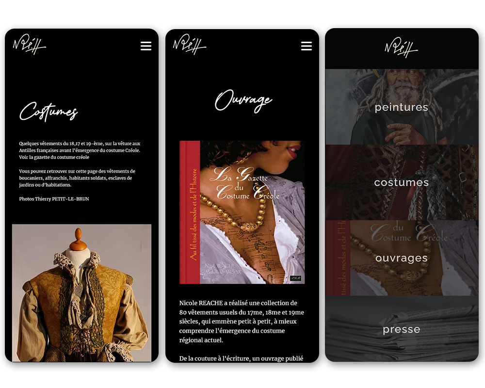 Le site se devait de laisser parler l’univers de Nicole Réache. J’ai donc conçu une interface très sobre mettant en valeur les œuvres et les couleurs chaleureuses des Antilles.