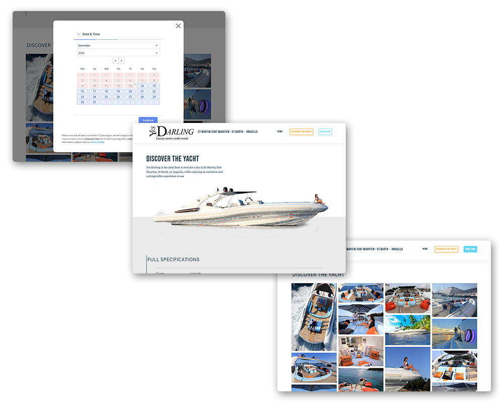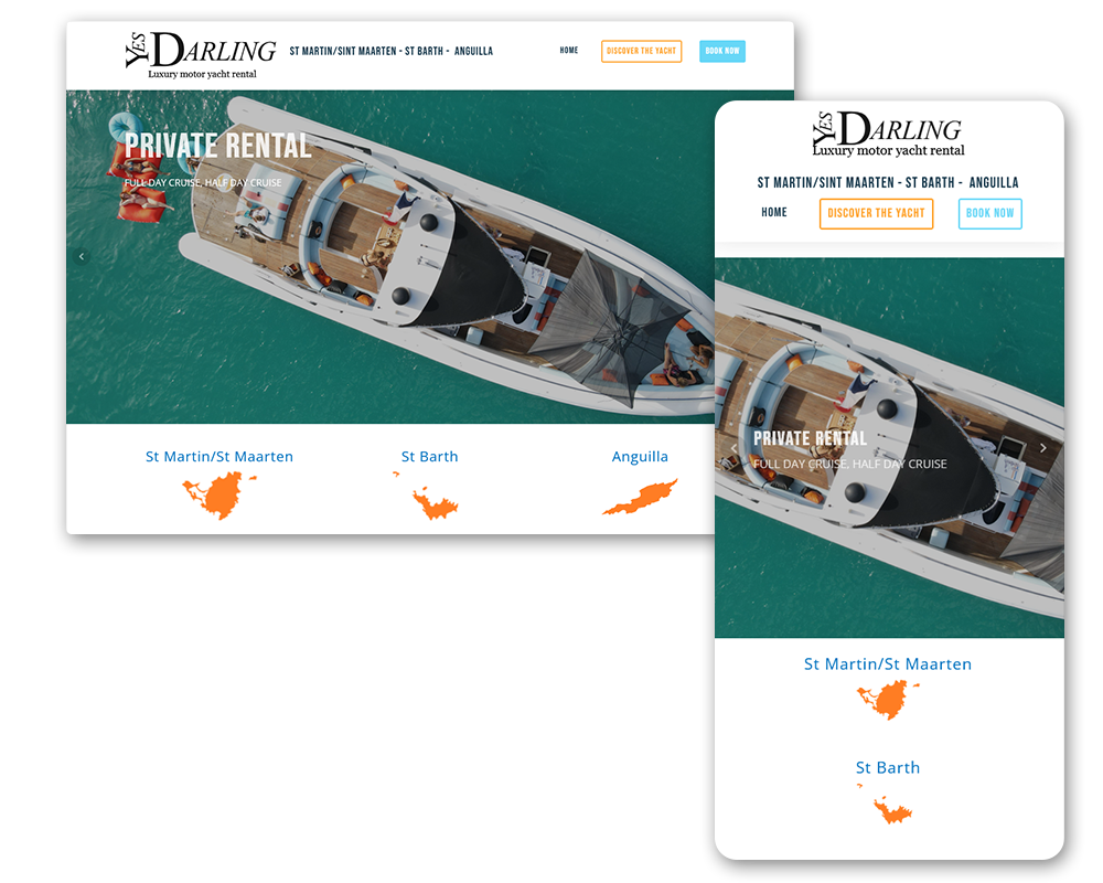 YesDarling est un yacht semi rigide dans les petites Antilles. Il propose des journées d’exception pour découvrir Saint Martin, Saint Barth ou encore Anguilla. J’ai conceptualisé, maquetté et intégré un site simple de quelques pages avec la possibilité de réserver et payer pour louer le bateau pour une journée ou une demi-journée.